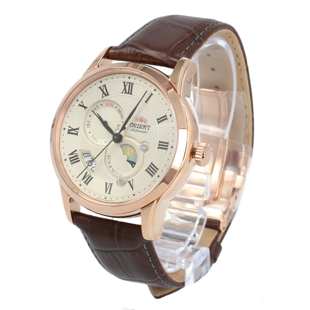 CLASSIC クラシック SUN&MOON サン ムーン 腕時計 メンズ 自動巻き レザー ブラウン ローズゴールド ホワイト シースルーバック